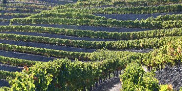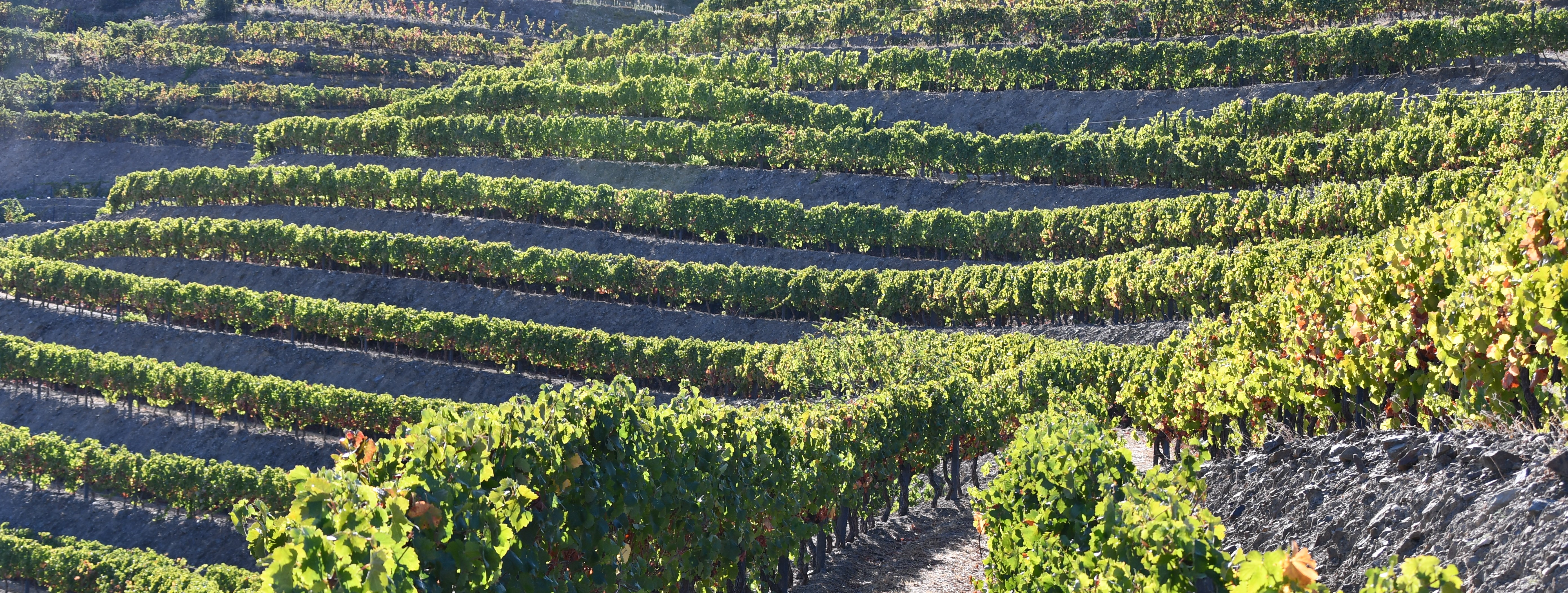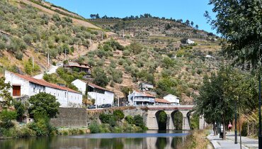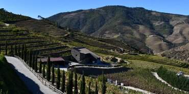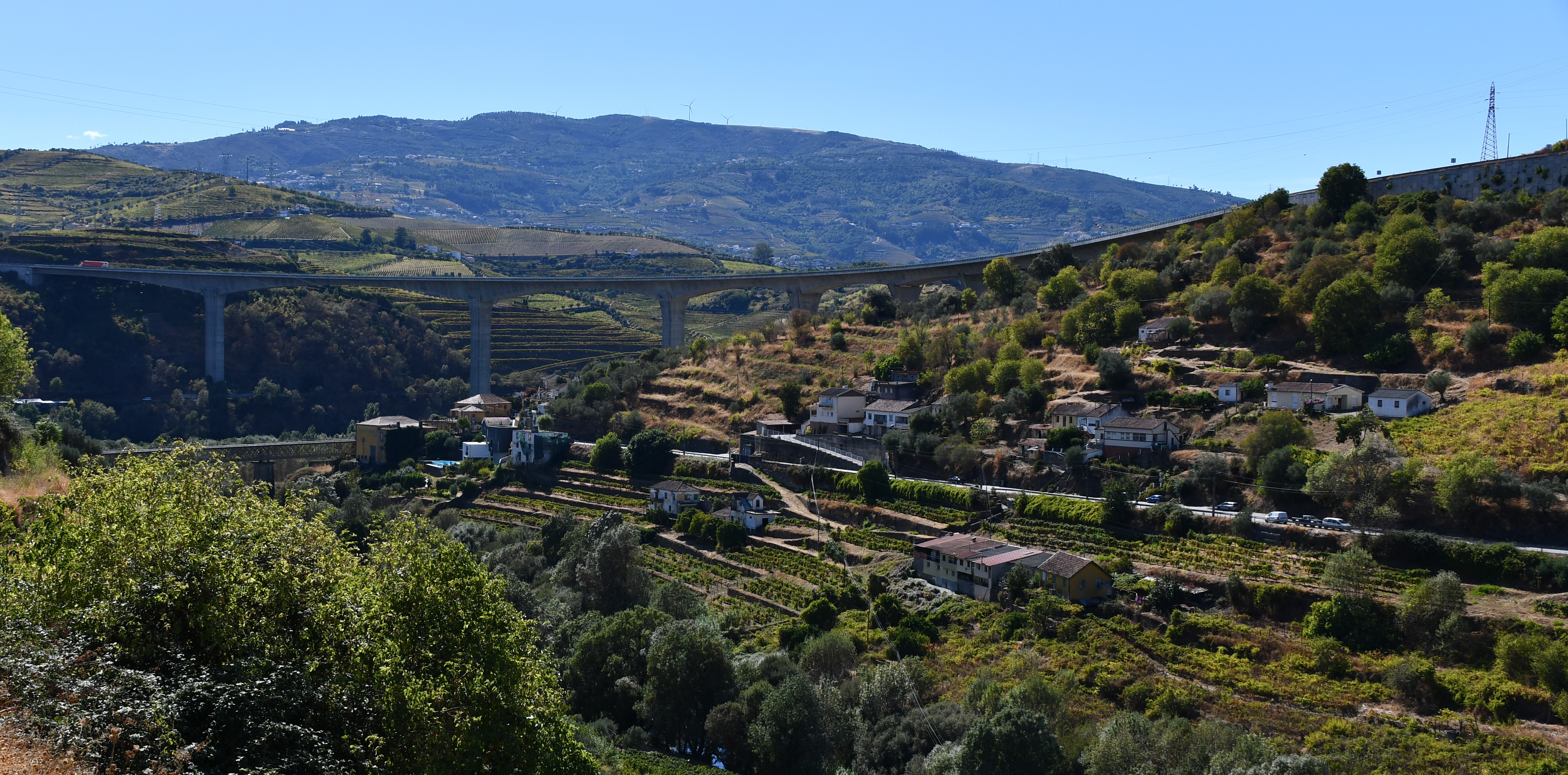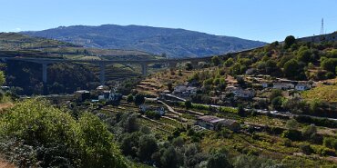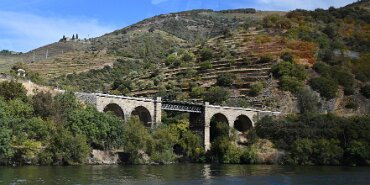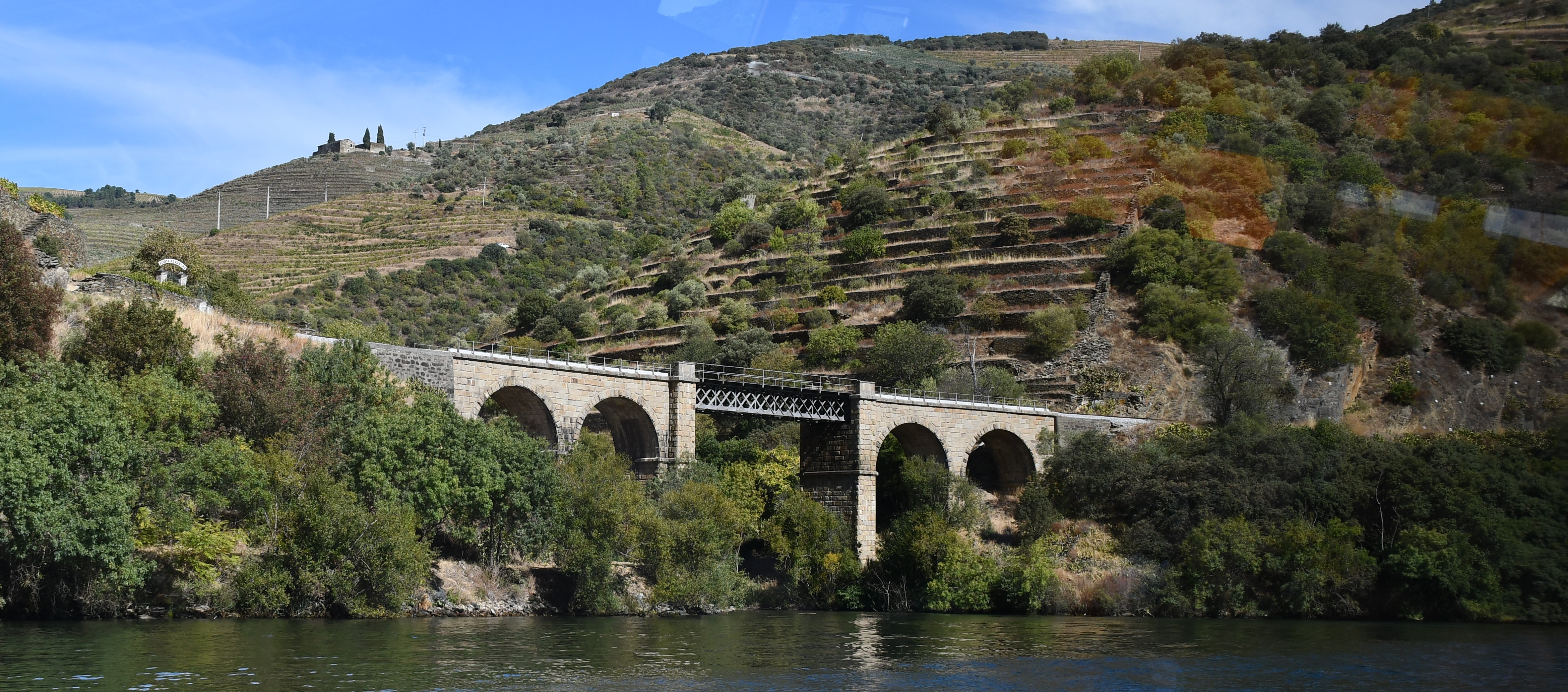 The scenic terraced vineyards of the Douro Valley in Portugal. The bridge in the background is the Miguel Torga Bridge which crosses the Douro Rove