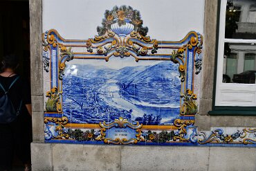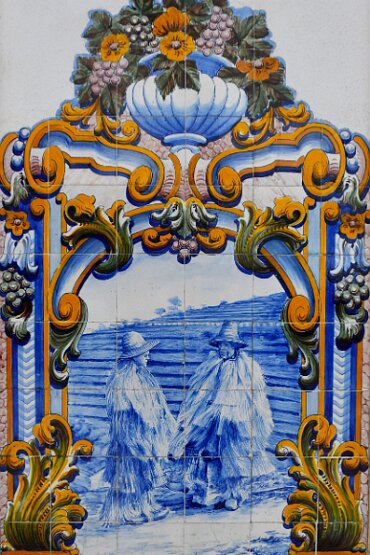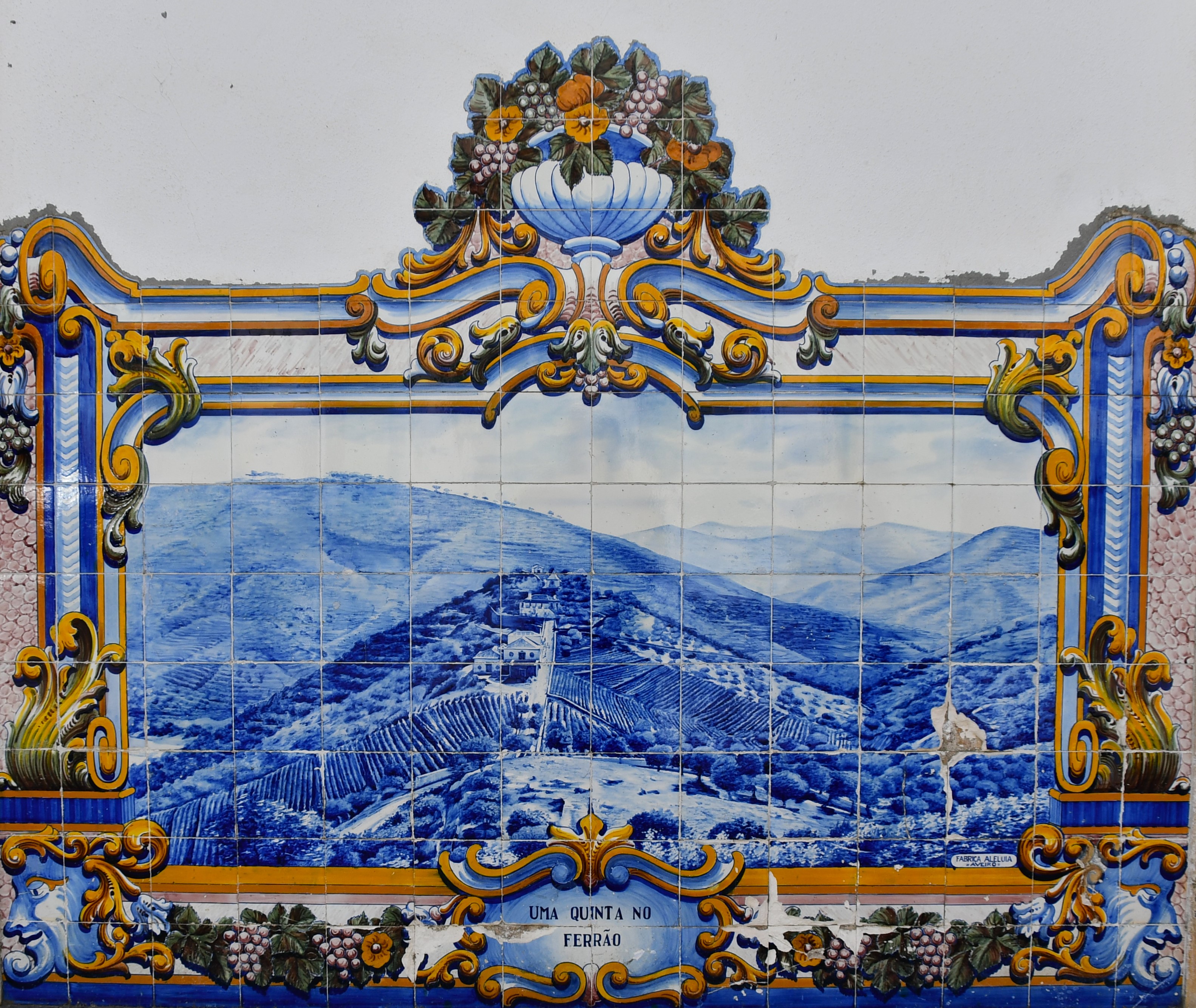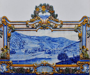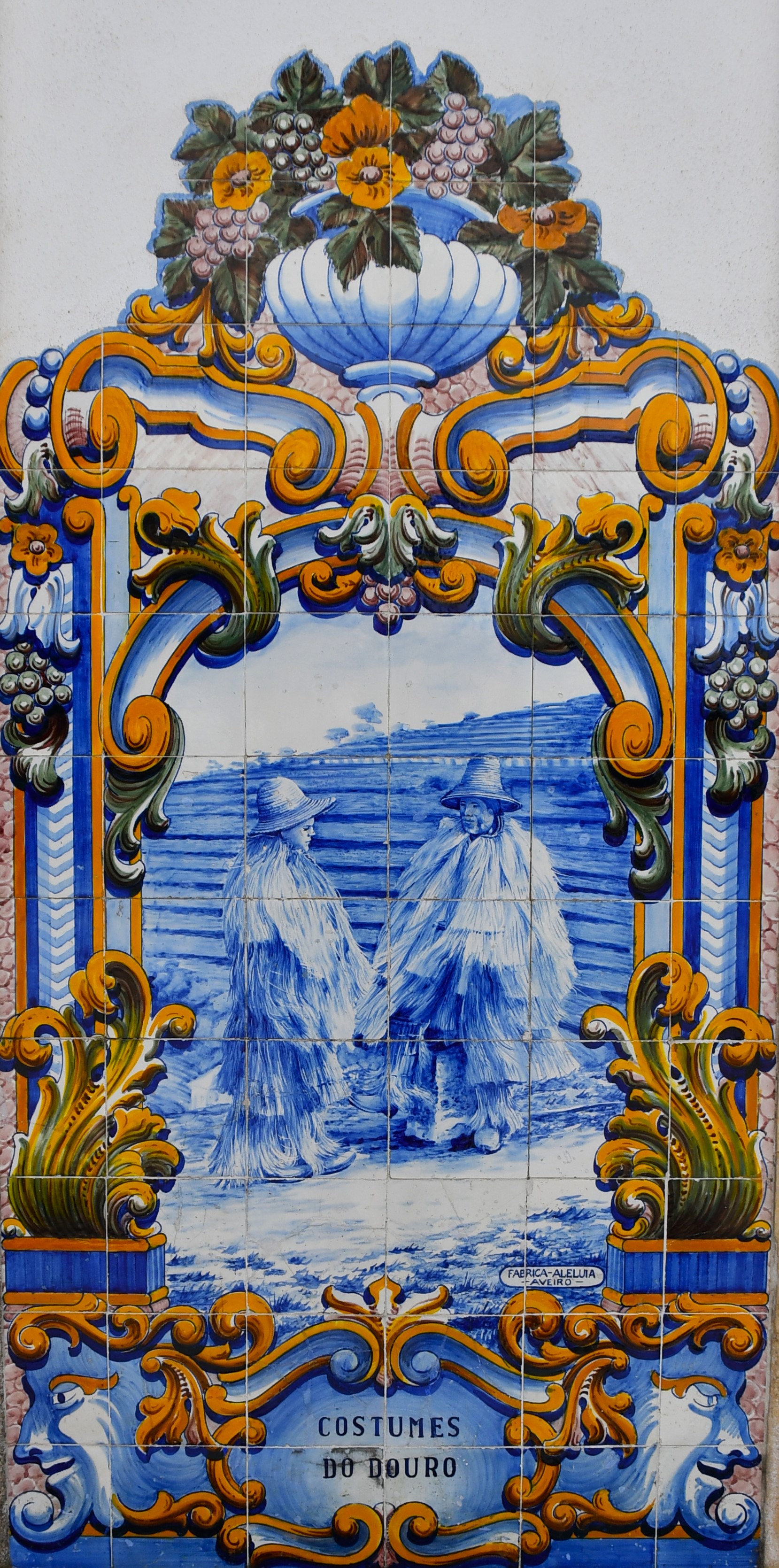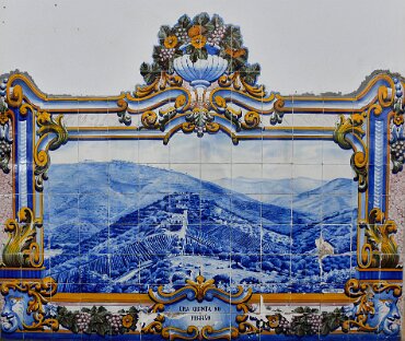 One of 24 traditional Portuguese azulejo tile panels at the Pinhão railway station in the Douro Valley, Portugal.