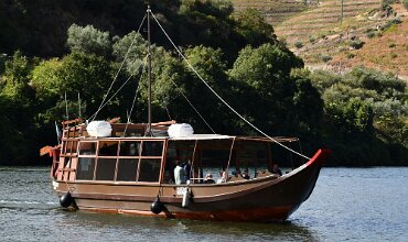A modern version of a traditional Portuguese rabelo boat on the Douro River near the town of Pinhão, Portugal.