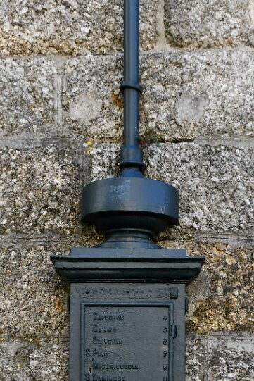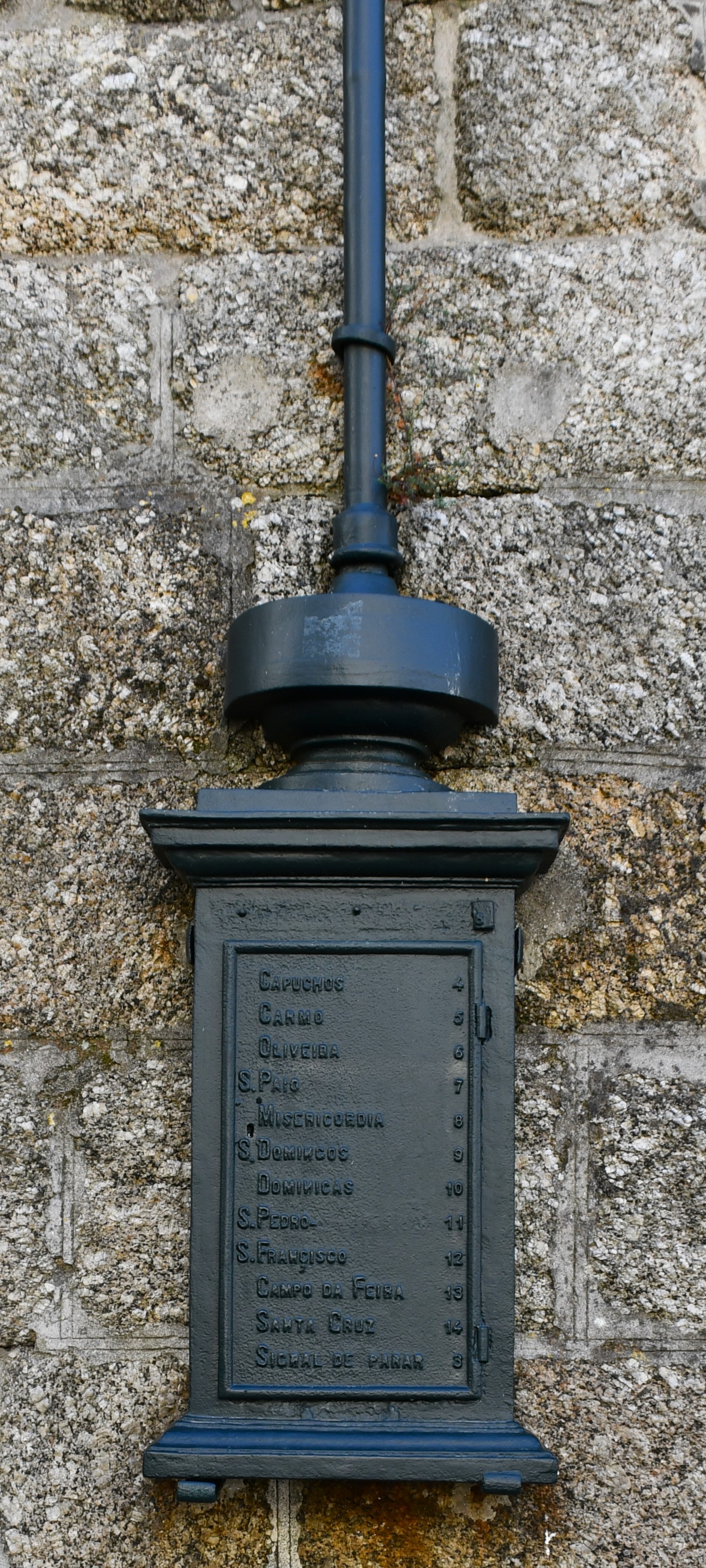 This is an old iron fire alarm box located near the Largo da Oliveira (Oliveira Square) in Guimarães, Portugal. The text on the box lists different locations…