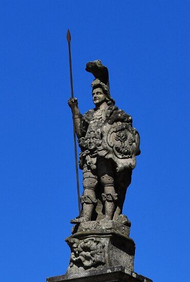 This statue of a knight is located in the Largo da Oliveira Square in the historic center of Guimarães, Portugal