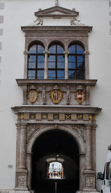 The main door and passage through one of the many old building in the Old Town area of Linz, Austria