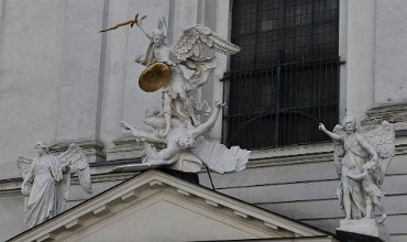 A group with winged angels and St. Michael slaying Lucifer. Sculptures by the Italian sculptor Lorenzo Mattielli. Church of Saint Michael, Michaelerplatz…
