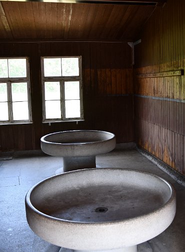 A latrine in one of the prisoner barracks. There were no partitions in the room to denying any privacy to the prisoners. Mauthausen Concentration Camp, Austria