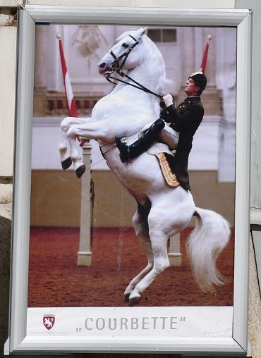 An advertisement for the Spanish Riding School which performs the classical dressage and the training of Lipizzaner horses. Vienna, Austria