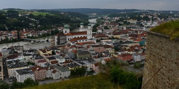 The hilltop fortress complex of Veste Oberhaus above where the Ilz River flows into the Danube at Passau, Germany