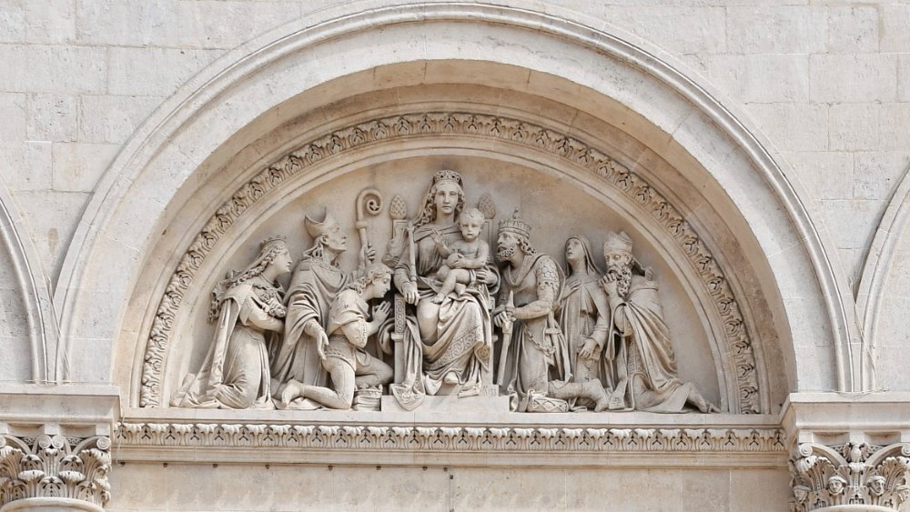 Detailed stone carving above one of the entrances into Saints Peter and Paul's Cathedral, Pécs, Hungary
