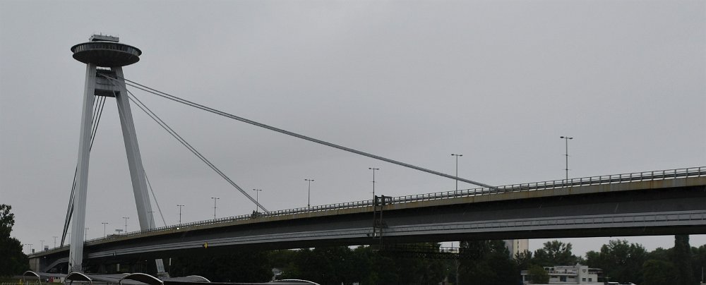 SNP Bridge's observation deck and "UFO" restaurant. Completed in 1972, the name SNP refers to "Bridge of the Slovak National Uprising". Bratislava, Slovakia
