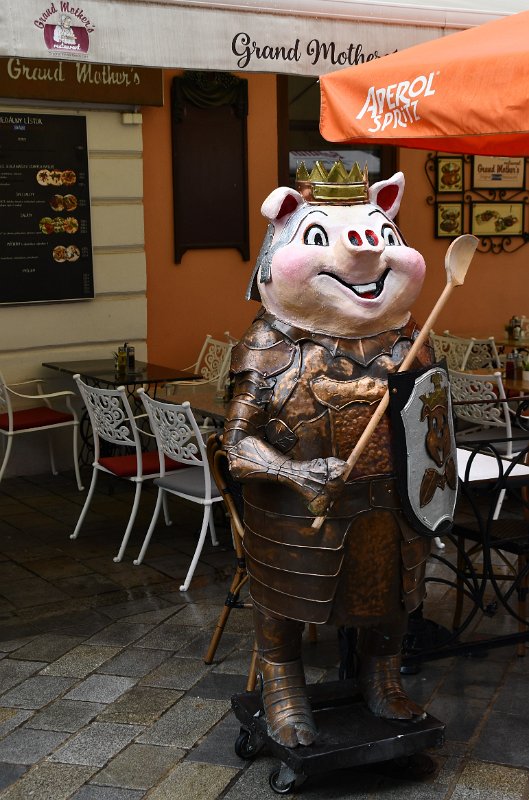 An armored pig standing outside Grand Mother’s Restaurant in the Old Town historical zone, Bratislava, Slovakia