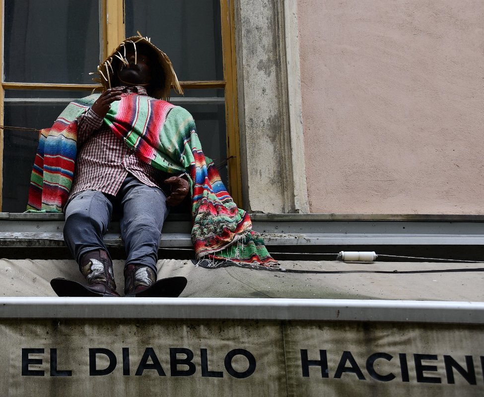 A mannequin dressed as a Mexican on the awning in front of Hacienda & El Diablo Bar, a Mexican Restaurant in the Old Town historical zone, Bratislava, Slovakia